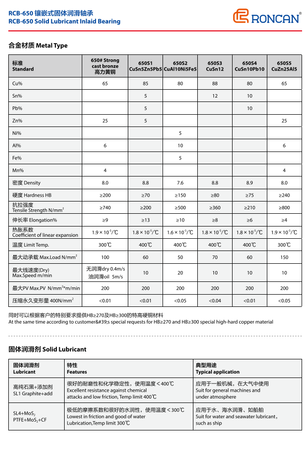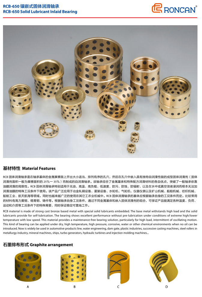 RCB650是通用的基礎產品,無論高壓、低壓、高溫、低溫、有油潤滑、無油潤滑還是水中潤滑。都能適用。產品的基體是高力黃銅,比一般的銅套硬度提高一倍。耐磨性能提高一倍以上。因此在冶金行業的連鑄機、軋機、輸送機上都可采用。還用于塑料注塑機鎖模機構,擠出機構。高壓電的自動開關,建筑機械的起吊支撐部位,以及水利樞紐工程的弧門支撐。滑輪和傳動輪部位。還有造紙機烘道、汽車模具、船舶起錨滑動部位等。